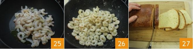 En una sartén, colocad a calentar un hilo de aceite y cuando esté bien caliente, saltead los gambas durante unos minutos (25-26) y luego dejadlos enfriar. Todo está listo para componer la tarta sándwich: cortad el pan brioche en rebanadas de aproximadamente 1 cm de grosor 27,