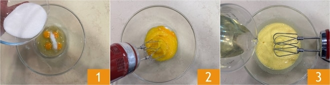 Para preparar la tarta sin gluten, vierte los huevos y el azúcar en un bol grande 1. Con las batidoras eléctricas, bate los huevos con el azúcar 2 hasta obtener una mezcla bien montada. Cuando esté clara y espumosa, añade el aceite de semillas en hilo, continuando con las batidoras eléctricas 3.