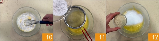 Mezcla con una batidora de mano de abajo hacia arriba con movimientos lentos y precisos 10. Añade también la fécula de patata tamizada 11 y la harina de almendras 12.