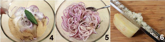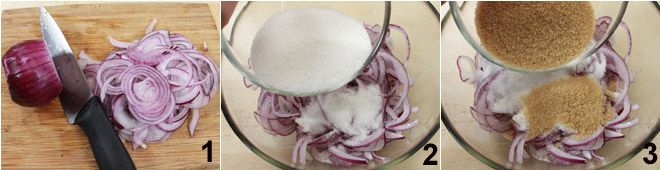 Comienza a preparar la mermelada de cebollas rojas de Tropea: limpia las cebollas y córtalas en rodajas muy finas 1 con la ayuda de una mandolina (o un cuchillo afilado), colócalas en un bol grande y añade los clavos de olor, el azúcar blanco 2 y el azúcar moreno 3 y el laurel