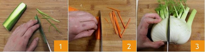 Para preparar las tortas de verduras juliana y Asiago, empieza por limpiar y cortar las verduras en juliana (también puedes consultar la Escuela de cocina: cómo cortar las verduras). Lava bien las verduras bajo agua corriente, luego corta los extremos de los calabacines y córtalos en juliana 1. Realiza la misma operación con las zanahorias 2 después de quitarles los extremos y pelarlas. Luego corta el hinojo por la mitad 3.