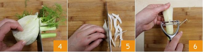 Quítale las puntas y la capa exterior más dura 4. Luego reduce a juliana la cantidad necesaria de hinojo 5. Pasa luego a eliminar la capa exterior del apio con un pelador de verduras 6.