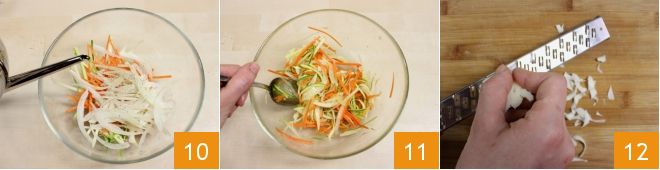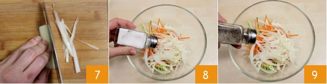 Reduce también el apio a juliana 7 y luego transfiere las verduras a un bol. Luego sala y pimienta al gusto (8-9).