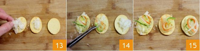 Empieza con el queso para componer las tortas: pon un poco de rizos en cada torta 13. Luego ayúdate con pinzas de cocina para agregar las verduras en juliana 14. Completa la operación para todas las tortas 15 y luego transfiérelas a una tabla de cortar o un plato para servirlas a tus invitados!