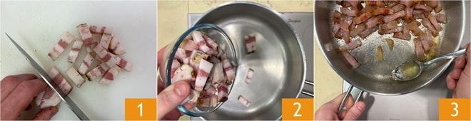 Para preparar los tortelli a la carbonara empieza por el relleno: corta el guanciale en tiras 1, ponlo en una sartén 2, enciende el fuego bajo y sofríelo hasta que esté dorado. Mientras se cocina, recoge la grasa de la sartén y resérvala 3.