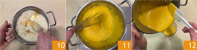 Mezcla todo con la batidora 10, luego vuelve a ponerlo al fuego al baño maría y cocina hasta alcanzar de nuevo los 60°, removiendo continuamente 11. Una vez listo, prueba y ajusta de sal si es necesario. Transfiere la crema obtenida a una jarra 12.