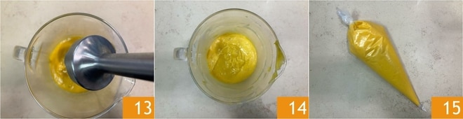 Tritura con la batidora de inmersión 13 para obtener una salsa lisa y homogénea 14. Transfiere el relleno a una manga pastelera sin boquilla 15 y deja reposar en el frigorífico por al menos 8 horas.