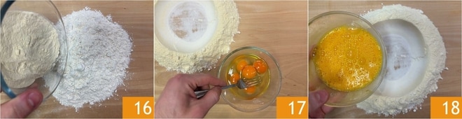 Para preparar la pasta fresca, coloca la harina y la sémola sobre una superficie de trabajo 16, mézclalas y crea el clásico volcán. Bate los huevos 17 y viértelos en el centro 18.