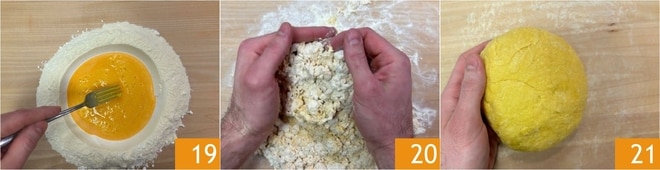 Comienza a amasar con un tenedor para recoger los ingredientes 19. Luego continúa amasando a mano, ayudándote con una espátula 20. Cuando tengas una masa lisa, firme y homogénea, forma un bloque 21. Cubre con film y deja reposar en la nevera por una hora.