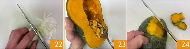 Ocupate de la crema de calabaza: limpia y corta la cebolla en juliana 22. Limpia la calabaza eliminando las semillas internas 23 y la piel 24.