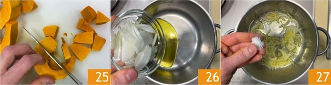 Luego corta 400 g de pulpa en trozos grandes 25. En una cacerola calienta un chorro de aceite, añade las cebollas 26 y deja que se cocinen con una pizca de sal hasta que estén tiernas 27.