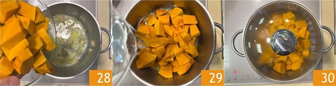 Añade la calabaza cortada en cubos grandes 28, vierte un vaso de agua 29 y cocina tapado durante unos 15 minutos 30, hasta obtener una calabaza cocida pero seca.
