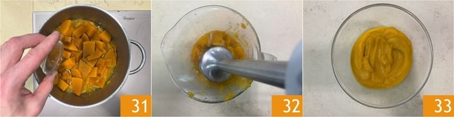 Cuando la calabaza esté cocida pero seca, desglasa con el vinagre 31, añade pimienta y cocina por 2 minutos más. Tritura la mezcla con la batidora de inmersión 32, luego pásala por un colador para obtener una crema lisa y sedosa 33.