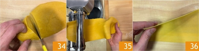 Retoma la pasta, toma una porción 34 y envuelve la restante en film para evitar que se seque. Extiende la pasta con el rodillo para adelgazarla lo suficiente para pasarla por el rodillo de la máquina de pasta 35. Pasa la lámina varias veces reduciendo gradualmente el grosor hasta alcanzar el más delgado, debe quedar casi transparente 36.