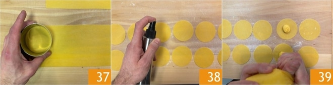 Recorta discos con un cortapastas de 8 cm de diámetro 37. Rocía las láminas con agua 38 (o pincela con un pincel de cocina) y exprime un poquito de relleno en el centro 39.