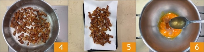 Cuando el guanciale esté bien dorado 4, déjalo secar sobre papel absorbente 5. En un bol de metal, mezcla las yemas, un poco de sal, abundante pimienta y parte de la grasa del guanciale reservada 6. Coloca el bol al baño maría sobre el fuego.