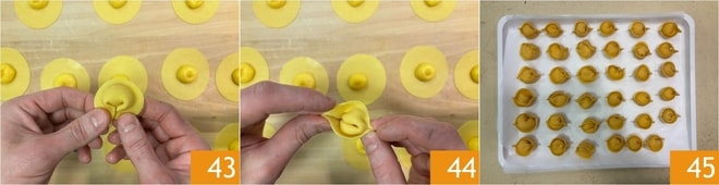 Ahora une los extremos 43 pellizcando las puntas desde ambos lados 44. Coloca los tortelli sobre una bandeja ligeramente enharinada con sémola 45. Obtendrás aproximadamente 80 tortelli con estas cantidades.