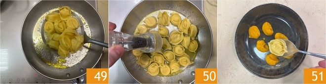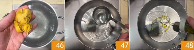 Cuece los tortelli en agua hirviendo durante 1,5-2 minutos como máximo 46. Mientras tanto, en una sartén vierte un cucharón del agua de cocción 47 y un chorro de aceite 48.