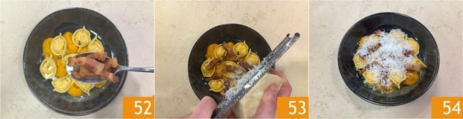 Completa con el guanciale 52 y con el Pecorino rallado 53. ¡Sirve enseguida tus tortelli a la carbonara caseros 54!