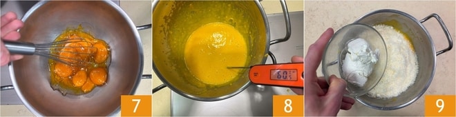 Batir con las varillas a mano 7 hasta formar una mezcla densa, similar a un zabaione; debes alcanzar los 60° para obtener la consistencia perfecta 8. Agrega fuera del fuego el Parmesano, el pecorino y el mascarpone 9.