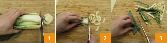 Para preparar los tortelloni con acelgas y crema de Parmesano comenzamos precisamente con la verdura. Después de quitar el tallo 1, cortad el lado corto de las pencas en tiritas 2 y la parte verde a lo largo 3.