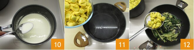 Debéis obtener una salsa lisa y sin grumos 10. En cuanto también esté lista, coced los tortelloni en agua hirviendo con sal siguiendo los tiempos indicados en el paquete 11. Procurad escurrirlos en cuanto estén al dente directamente en el condimento 12.