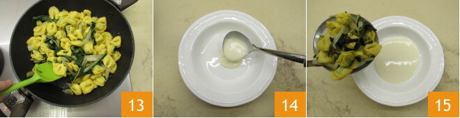 Saltead rápidamente para amalgamar los sabores 13 y pasad al emplatado. En el fondo del plato verted un poco de crema de queso 14, luego los tortelloni condimentados 15.