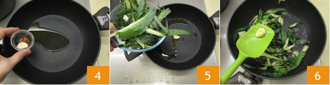 En una sartén calentad un chorrito de aceite y sazonad con ajo pelado y guindilla 4. Tan pronto como el fondo esté caliente, echad las acelgas cortadas 5 y dejadlas sofreír un momento a fuego lento, removiéndolas de vez en cuando, luego retirad el ajo de la sartén 6.