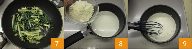 Después de unos 10 minutos las acelgas estarán listas 7. Pasad ahora a la crema de Parmesano: verted la nata en un cazo, encended a temperatura media el fogón y verted en forma de lluvia el Parmesano rallado 8. Remover de vez en cuando con una varilla 9.