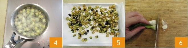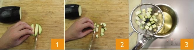 Para preparar la tortilla de berenjenas y tomates cherry, lo primero que hay que hacer es lavar las berenjenas, quitarles los extremos y cortarlas primero en rodajas y luego en cubos de aproximadamente 1 cm de grosor (1-2). Calienta abundante aceite y llévalo a una temperatura de 170°. Cuando esté caliente, sumerge las berenjenas poco a poco 23,