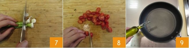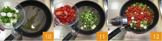 añade las cebolletas 10 y los tomates cherry 11. Salpimienta 12