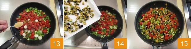 y añade 1 cucharadita de azúcar moreno 13. Deja cocinar durante 5 minutos a fuego alto, luego añade también las berenjenas fritas 14 y saltea todo junto.