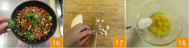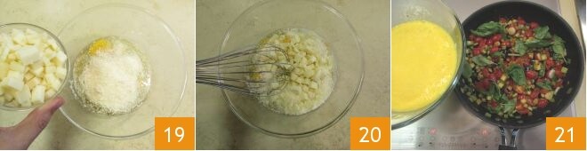 y el caciocavallo 19. Bate todo 20 y vierte en la sartén 21.