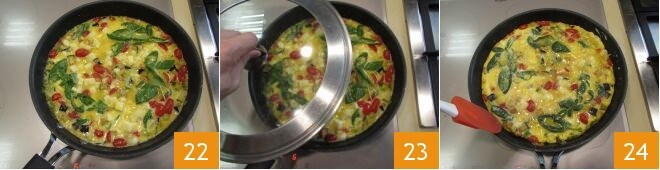 Espera unos segundos 22, luego cubre con una tapa 23 y deja cocinar durante unos diez minutos a fuego medio-bajo. Pasados los 10 minutos, utilizando una espátula, despega los bordes de la tortilla de la sartén 24
