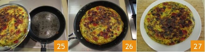 y utilizando la tapa, o un plato más grande, dale la vuelta a la tortilla 25. Continúa la cocción durante otros 2 minutos 26 y sirve tu tortilla con berenjenas y tomates cherry 27.
