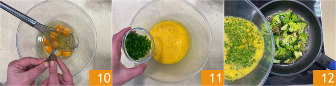 Añade también una pizca de nuez moscada 10 y cebollino finamente picado 11. Bate bien la mezcla y viértela sobre los brócolis, después de haber eliminado el ajo 12.