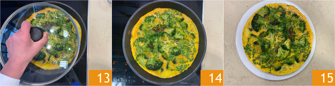 Cubre con una tapa y cocina a fuego lento durante unos 15 minutos 13; de esta manera no será necesario dar la vuelta a la tortilla 14. Una vez dorada, ¡sirve enseguida tu tortilla de brócoli 15!