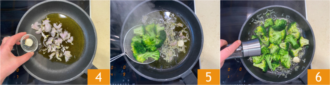 En una sartén, vierte el aceite, la chalota y el ajo 4. Deja que se cocine a fuego lento durante unos 5 minutos, luego escurre los floretes de brócoli directamente en la sartén 5. Añade también un poco de agua de cocción y la pimienta 6.