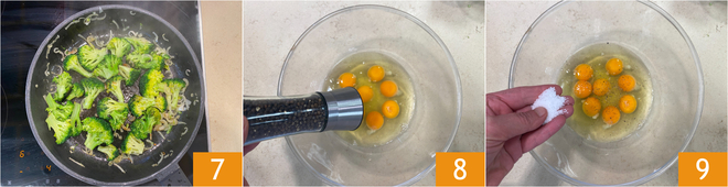 Cocina a fuego medio-alto durante unos 8 minutos 7. Mientras tanto, rompe los huevos en un bol y sazona con pimienta 8 y sal 9.