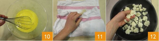 Batid todo con un batidor 10. En este punto, secad las flores de coliflor 11 para que queden bien secas. Calentad un poco de aceite en una sartén y colocad en el fondo las flores de coliflor 12.