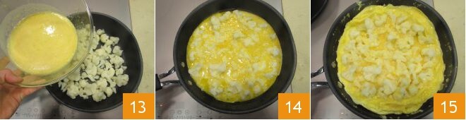 Cuando la sartén esté bien caliente, verted sobre las coliflores la mezcla de huevos (13-14). En este punto, cocinad la tortilla durante unos 15 minutos a fuego medio-bajo 15, ayudándoos con un tenedor para que el huevo crudo en la superficie se filtre hacia el fondo de la sartén.