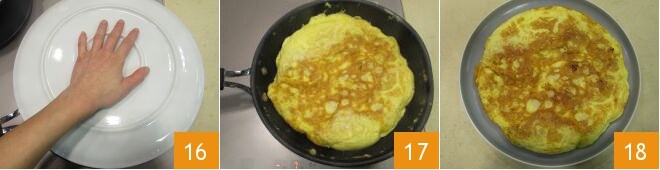 Usando un plato grande o una tapa, dad la vuelta a la tortilla 16 y continuad la cocción por otros 5 minutos del otro lado 17. ¡Vuestra tortilla de coliflor está lista: servidla bien caliente 18!