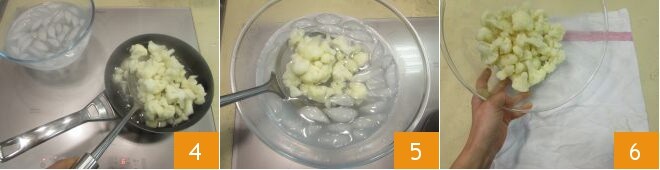 Utilizando una espumadera, escurrid la coliflor 4 e inmersidla en un bol con agua y hielo 5 para detener la cocción. Luego transfierela a un paño de cocina seco y limpio 6.
