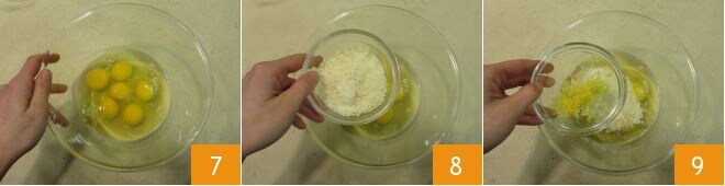 Romped los huevos en un bol 7, añadid el queso rallado 8 y la cáscara de limón 9.