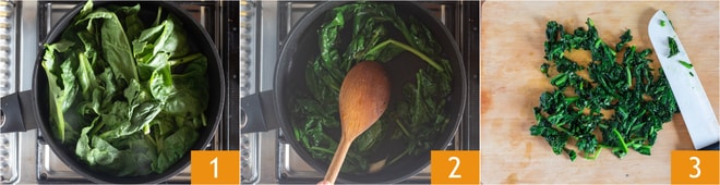 Para preparar la tortilla de espinacas, primero lave y limpie las espinacas eliminando los tallos más duros. Sofría en una sartén (recomendamos una sartén de 20-22 cm de diámetro que también servirá para cocinar la tortilla) un diente de ajo con piel con un chorrito de aceite durante un par de minutos. Añada las espinacas 1 y saltéelas durante unos diez minutos. Salpimiente ligeramente las espinacas, apague el fuego, retire el diente de ajo y déjelas enfriar un poco 2. Luego escúrralas, exprímalas bien y píquelas finamente 3.