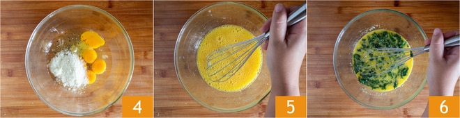 Rompa los huevos en un bol, luego añada el Parmigiano Reggiano rallado, una pizca de pimienta negra y una pizca de sal 4. Bata los huevos con las varillas 5, o con un tenedor, hasta que yemas y claras estén completamente integradas. Añada las espinacas a la mezcla de huevos y mezcle rápidamente 6.
