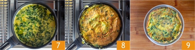 Caliente un chorrito de aceite de oliva virgen extra en la misma sartén en la que cocinó las espinacas, vierta la mezcla de huevos 7 y cocine con tapa a fuego lento durante unos diez minutos. Cuando la superficie de la tortilla comience a solidificarse, déle la vuelta a la tortilla, ayudándose con un plato llano, una tapa o una espátula ancha. Continúe la cocción por otros 5 minutos aproximadamente 8 o el tiempo necesario para dorar la tortilla. Sirva la tortilla de espinacas aún caliente 9.
