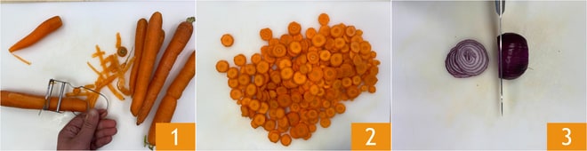 Para preparar la tortilla de guisantes y zanahorias, pelad las zanahorias 1 y cortadlas en rodajas de un grosor de 4-5 mm 2. Limpiad y cortad las cebollas 3.