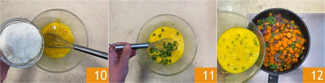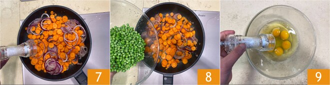 y sal 7. Ahora, añadid también los guisantes 8 y coced durante otros 10 minutos todo junto. Mientras tanto en un bol, batid los huevos con sal 9,