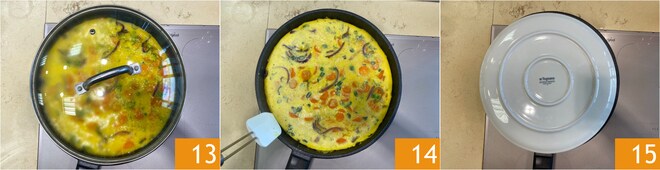 Cubrid con una tapa 13. Bajad el fuego y coced durante unos 10 minutos. Cuando la superficie esté poco blanda pero aún húmeda 14, dadle la vuelta a la tortilla ayudándoos con un plato llano 15.